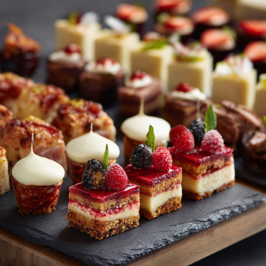 Delicious assorted sweet slices, perfect bite-sized treats for any catering event or gathering.